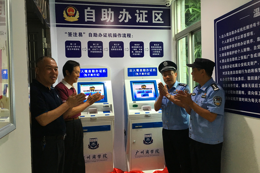 仪式上,学院党委书记吕泉荣、监事会主席刘炳荣和黄埔区公安分局人口大队教导员陈俊孟、镇龙派出所副所长吴桂强共同为广州康大职业技术学院自助办证区揭幕。据介绍,出入境自助办证机服务对象为持有卡式通行证的个人,可续办香港或者澳门个人游签注业务。它是具有信息读取、签注打印、签注信息查询、刷卡缴费等多个功能于一体的智能自助受理平台,除具备免预约、立等可取的高效功能外,它还具备查询电子港澳通行证剩余有效次数及业务审批状态的功能。
